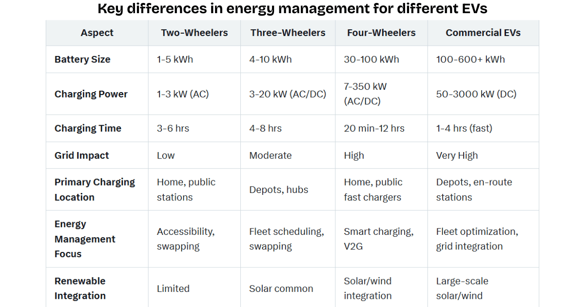 How does energy management for EV charging stations differ for electric two-wheelers, three-wheelers, four-wheelers & commercial EVs?