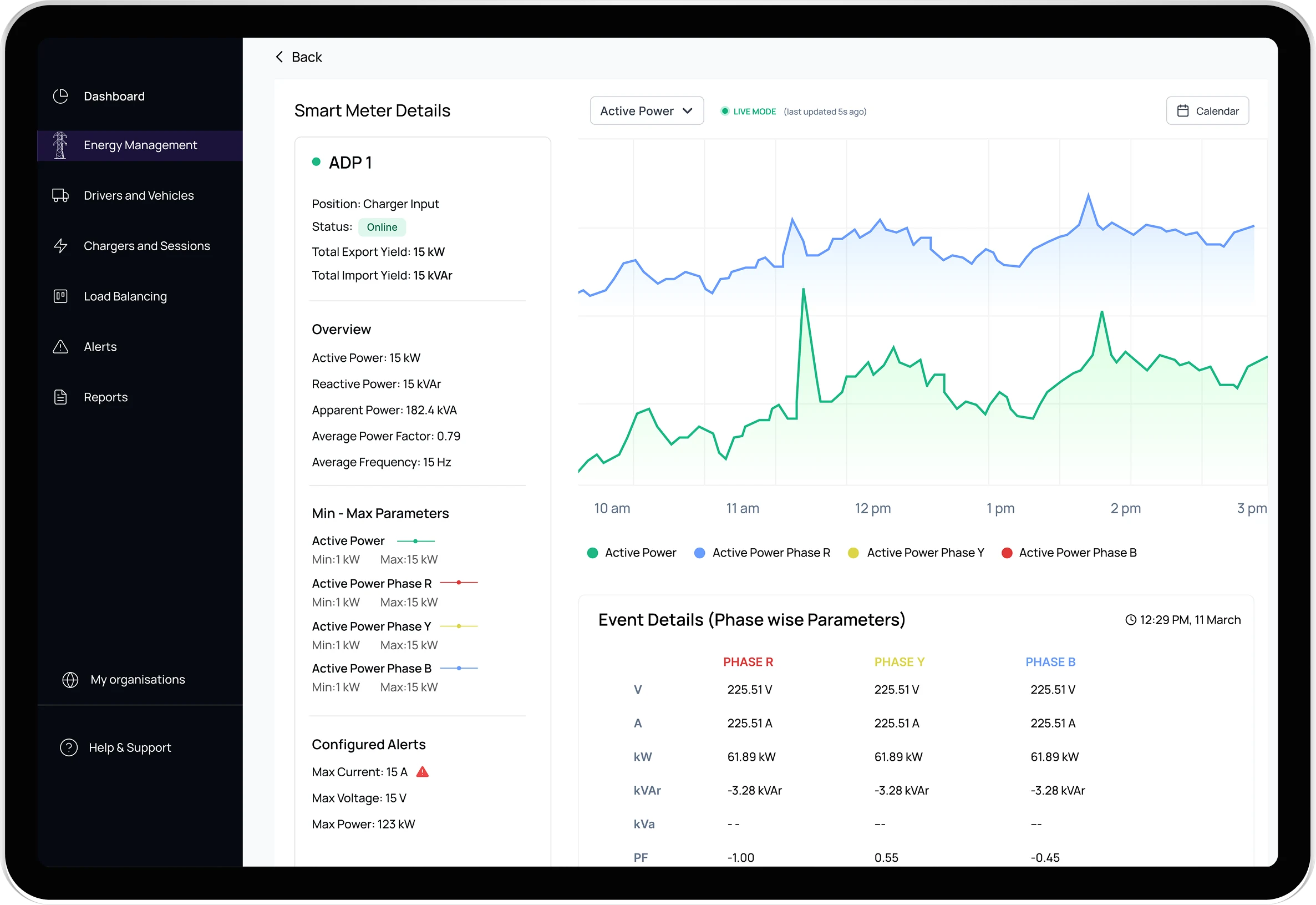Visualize complete energy flow from grid connection through transformers to individual chargers. Monitor real-time consumption, efficiency rates and power quality metrics across your entire depot infrastructure.